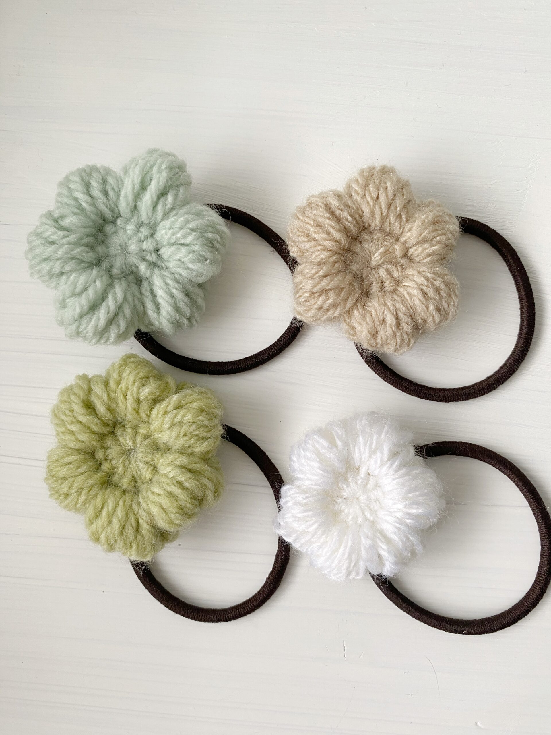 - 必要な材料は毛糸、かぎ針、ヘアゴムなど